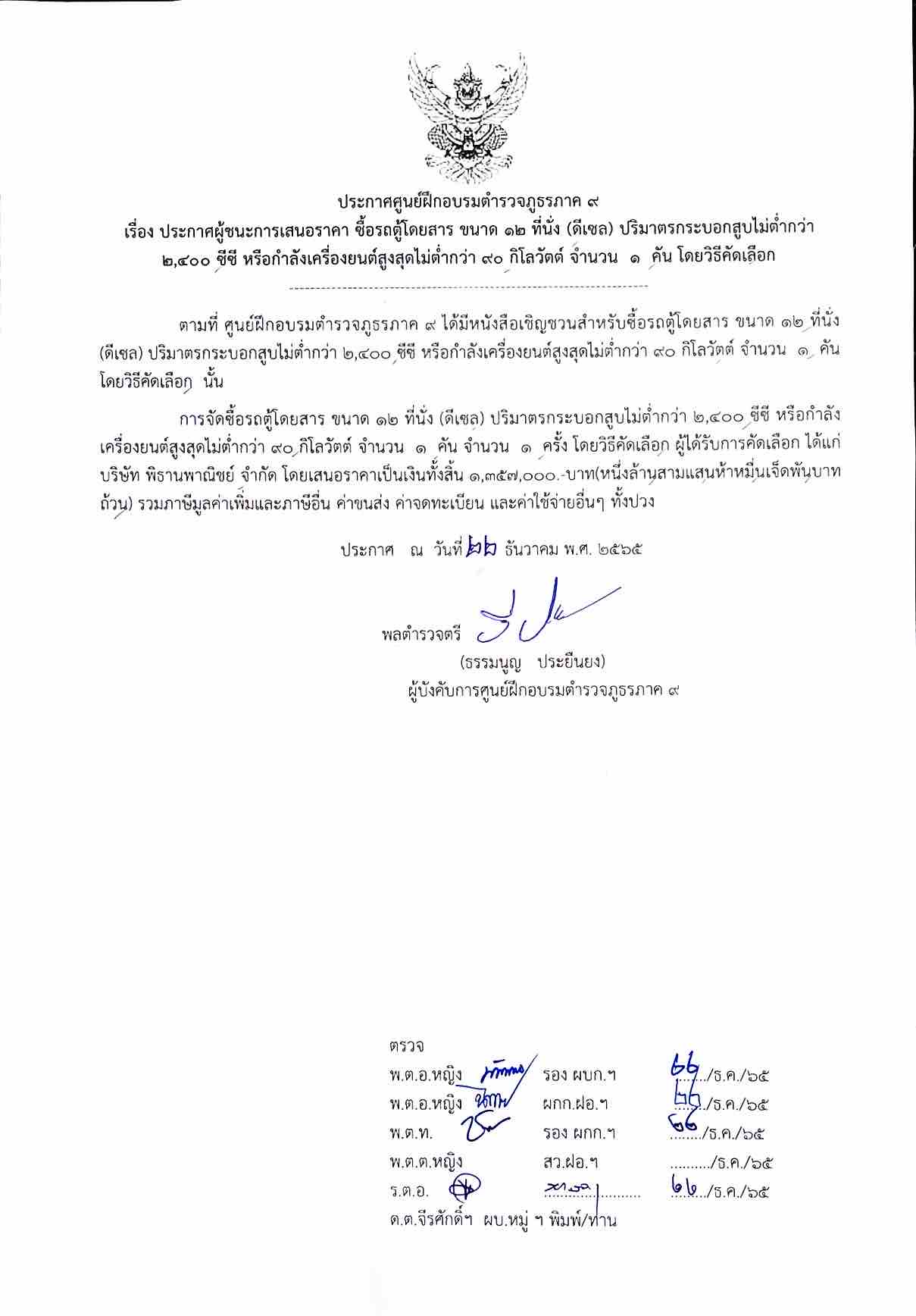 ประกาศผู้ชนะการเสนอราคา ซื้อรถตู้โดยสาร ขนาด 12 ที่นั่ง จำนวน 1,357,000 บาท